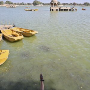 砂漠の街にありながら、心を落ち着かせてくれる水辺もあります。それがガディサール湖(Gadisar Lake)。かつて水源として利用されていた人工湖で、現在は美しい景観が人気のスポット。