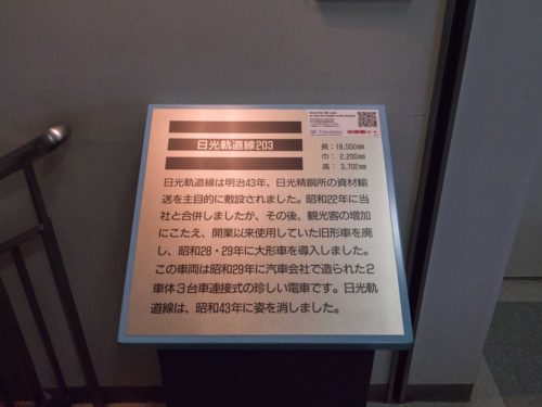 下の2両は外から見ます。館内からは座席にアクセスできるので座って休憩できます。日光軌道203号は可愛らしい外観です。