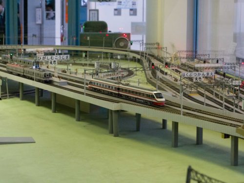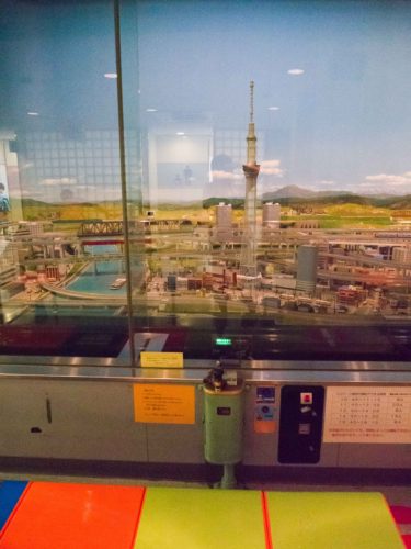 東武鉄道が走る町の模型です、時間になると走り出します。自動で走る時間が終わるとお金を入れて遊べるようになります。