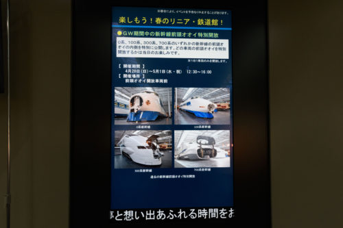 SL、300X、リニアモーターカー、700系、300系、100系、0系、ドクターイエロー、その他多数展示されています。GW中は新幹線の先頭を外して連結器を見せてもらえるイベントが行われています。1日1台なのでどの車両を見られるかは行かないと分からなそうです。4/30は0系でした。